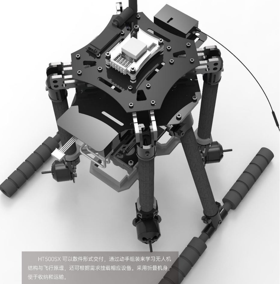 HT500SX 可以散件形式交付,通过动手组装来学习无人机结构与飞行原理,还可根据需求挂载相应设备。采用折叠机身便于收纳和运输